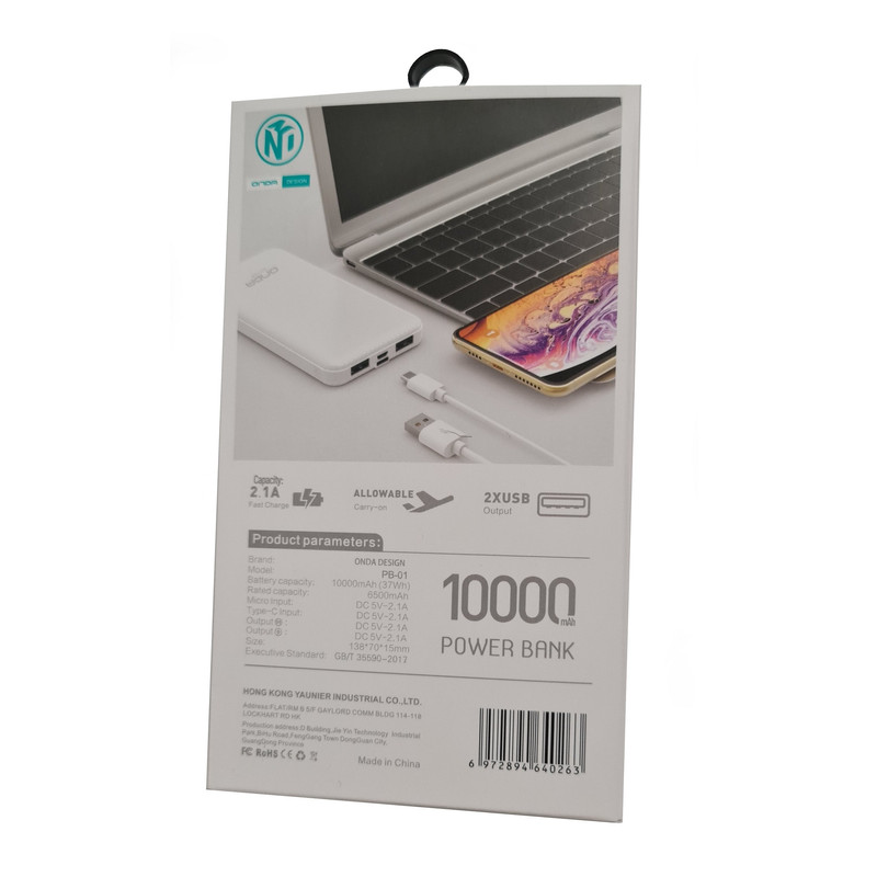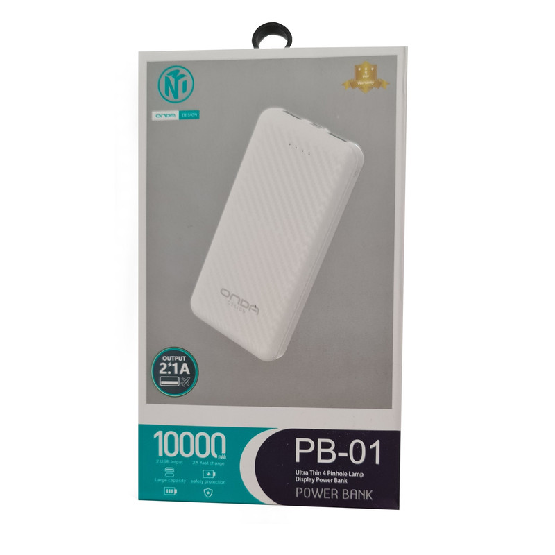 پاور بانک PB-01 ساخته شده توسط شرکت ONDA دارای 2 خروجی (دو خروجی usb برای شارژ دستگاه الکترونیکی شما) و 2 ورودی ( Micro usb و usb Type C جهت شارزخود پاوربانک ) دارد. باتری به کار رفته در این پاور بانک لیتوم یونی بوده و ابعاد آن 68 × 138 × 15 میلی متر است که شما بتوانید آن را همیشه همراه با خود داشته باشید. طراحی زیبا ، فناوری شارژ Qi با باتری قابل شارژ 10000mAh این امکان را به شما میدهد که از این کالا به عنوان یک یک پاور بانک قدرتمند قابل حمل بهره ببرید و به طور همزمان 2 دستگاه را شارژ کنید. با داشتن این پاور بانک دیگر هیچ نگرانی بابت تمام شدن شارژ دستگاه نخواهید داشت. این شارژر همراه مناسب برای انواع گوشیها و تبلتها و دستگاههای پخش موزیک همراه (MP3 Player) عرضه شده است. این پاوربانک دارای یک پورت میکرو USB و یک پورت Type C برای شارژ خودکار با قابلیت شارژ سریع خود پاوربانک است و همچنین دو پورت USB با قابلیت تنظیم بهینه سرعت شارژ که بطور خودکار برای دستگاه های Android یا iOS تا 2.1 آمپر تشخیص می دهند. روی بدنهی این مدل از شارژرهای همراه اوندا نشانگر LED وجود دارد که وضعیت باتری را نمایش میدهد. .در نهایت اگر بدنبال پاوربانکی زیبا با امکانات و پورت های متعدد هستید ما این مدل شرکت ONDA را به شما پیشنهاد میکینم.