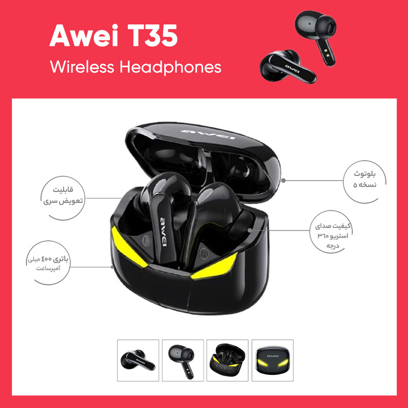 هدفون بی سیم مدل T35 محصولی از برند اوی است. این هدفون به صورتی طراحی شده تا در استفاده دراز مدت گوشتان را اذیت نکند. یکی از دلایل این ویژگی وزن سبک این مدل است. از طریق بلوتوث میتوانید این هدفون را به گوشی هوشمندتان متصل کرده و از قابلیت پخش موسیقی و مکالمه آن بهرهمند شوید. برای این مدل بلوتوث نسخه 5.0 در نظر گرفته شده و برد بلوتوث این هدفون تا 10 متر محاسبه شده است. این مدل محفظه شارژ شونده دارد و همین باعث شده تا زمان بیشتر بتوانید از این مدل استفاده کنید و این مدل به شما امکان پخش موسیقی تا 5 ساعت را میدهد و برای شارژ مجدد کافی است هدفونها را در محفظه قرار دهید و پس از 1 ساعت هدفونتان شارژ میشود.ظرفیت محفظه شارژ 400 میلی آمپر است که تا 5 بار می توانید گوشی های هندزفری را با ان شارژ مجدد کنید . این مدل به راحتی در گوش قرار میگیرد و کیفیت بالایی دارد. جنس استفاده شده برای این هدفون سیلیکون و ABS است. این هدفون توانسته گواهی IPX5 را کسب کند همین باعث شده تا نسبت به قطرات آب و رطوبت مقاوم باشد.
